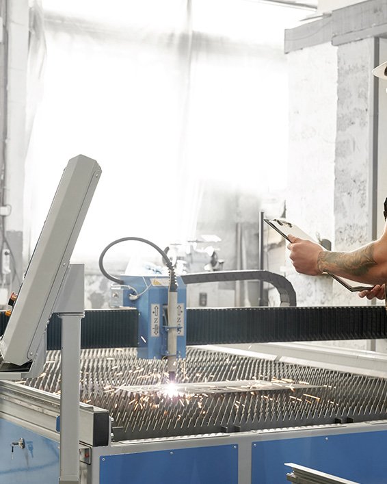 A factory equipped with modern machinery, including Laser Cutting Machines, Shearing Machines, CNC Press Brakes, CNC Milling Machines, MIG/TIG Welding Machines, Sandblasting Machines, CNC Machining Centers, and more.